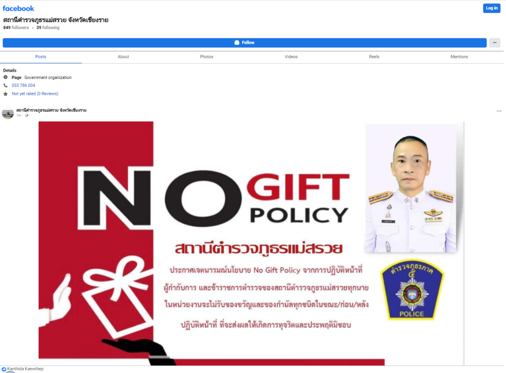 ผู้กำกับการประชาสัมพันธ์ No Gift Policy 15 กันยายน 2565 โดย / ข่าวภารกิจผู้บังคับบัญชา พ.ต.อ.ปริญญา เพชรมี ผกก.สภ.แม่สรวย ร่วมกิจกรรมประกาศเจตนารมณ์ No Gift Policy โดยประกาศลงในสื่อโซเชียลให้ประชาชนทราบโดยทั่วกัน